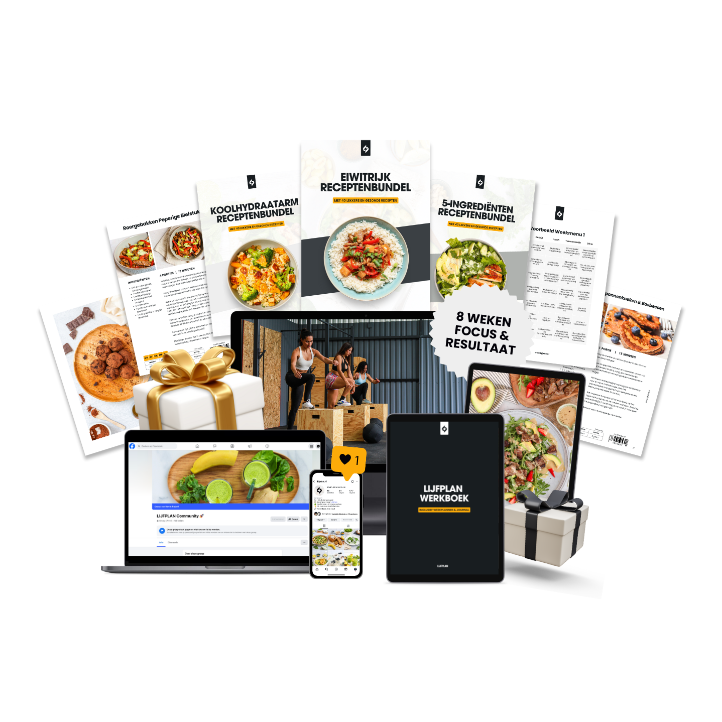 Het complete LIJFPLAN Transformatiepakket: je krijgt het werkboek thuisgestuurd en wordt stap voor stap begeleid door het 8-weken traject, inclusief weekopdrachten en reflecties.